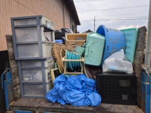 南島原市有家町にて、不用品回収のご依頼をいただきました。 押し入れ収納ケースやプラスチック容器、ホースリール、かご類、家電など、まとめて処分のお手伝いをさせていただきました。 ご利用いただきありがとうございました。